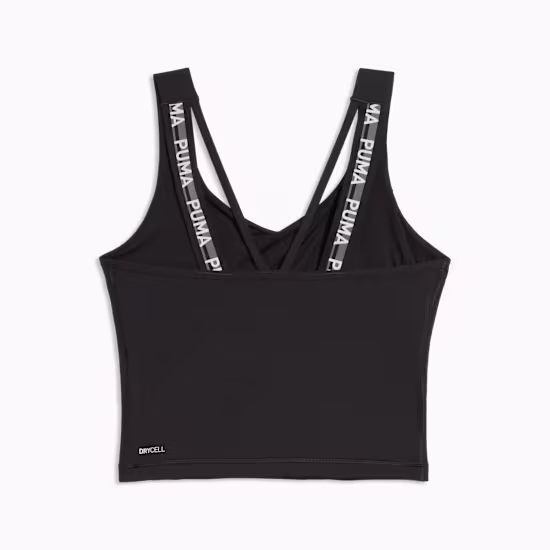 Μαύρο γυναικείο κοντό τοπ PUMA με τιράντες με χιαστί πλάτη. Κατασκευασμένο για προπόνηση υψηλής έντασης, το φανελάκι PUMA STRONG σας βοηθά να παραμένετε στεγνοί και συγκεντρωμένοι σε κάθε επανάληψη. Οι τιράντες με αθλητική πλάτη με την επωνυμία προσφέρουν μια καθαρή αθλητική εμφάνιση.